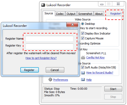 Click "Register!" link on Lukool Recorder, input your email address that received the order as "Registery Name"; input the "Activation key" in the order email as "Register Key".